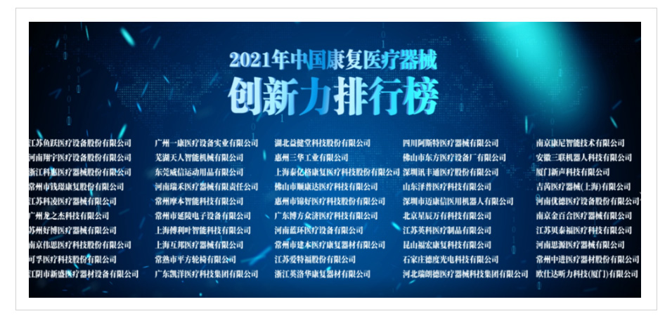 为推进中国康复医疗器械自主研发,鼓励优秀康复医疗器械企业发挥带动作用,深化科技创新,努力把企业做大做强,上海康复联盟联合2021CRME组委会、国家康复辅具中心、上海交通大学康复辅具创新中心、上海交通大学康复工程研究所、民政部智能控制与康复技术重点实验室等单位发布"2021年中国康复医疗器械企业创新力排行榜"