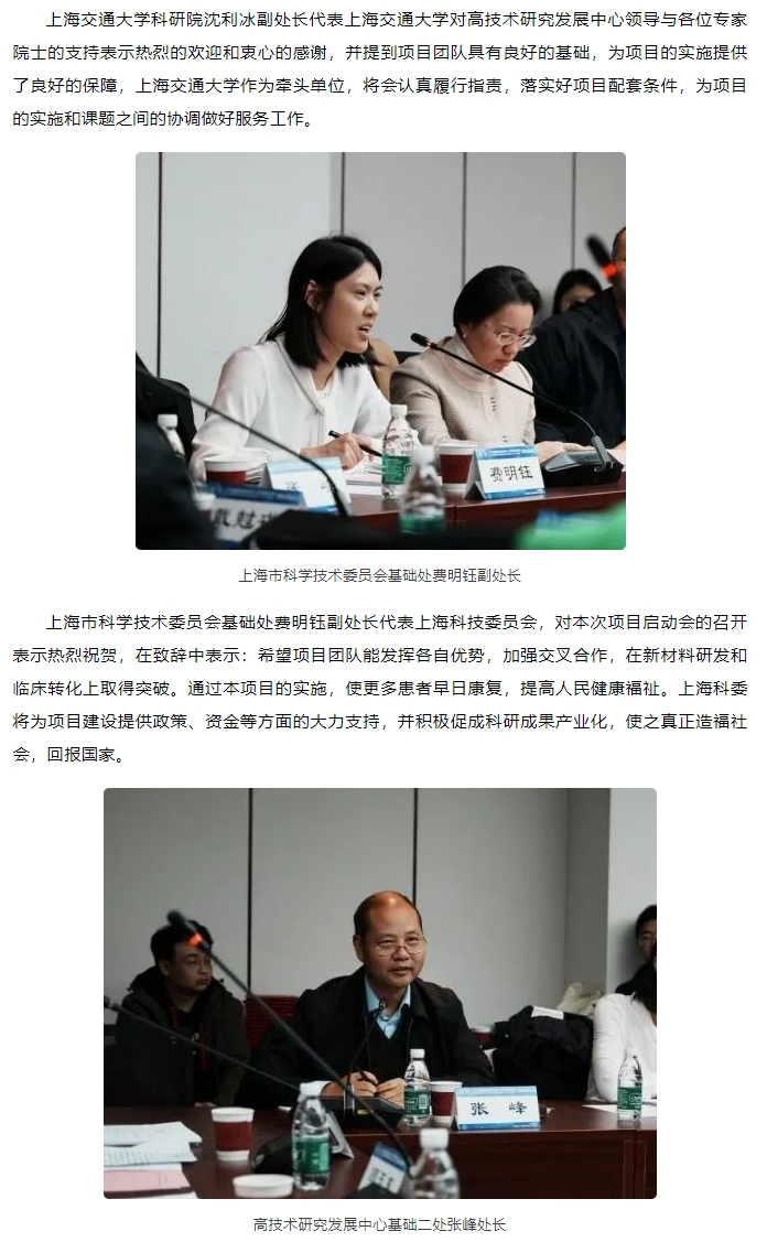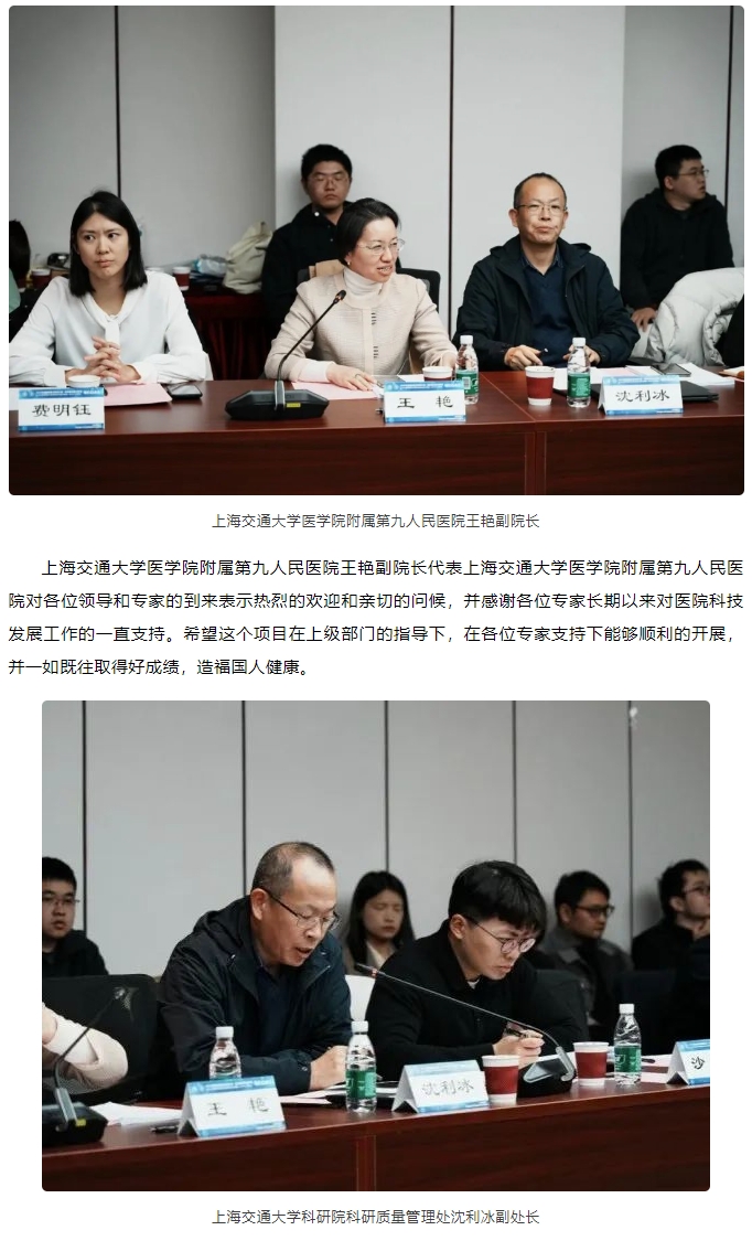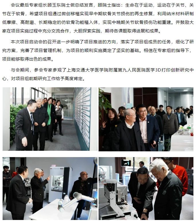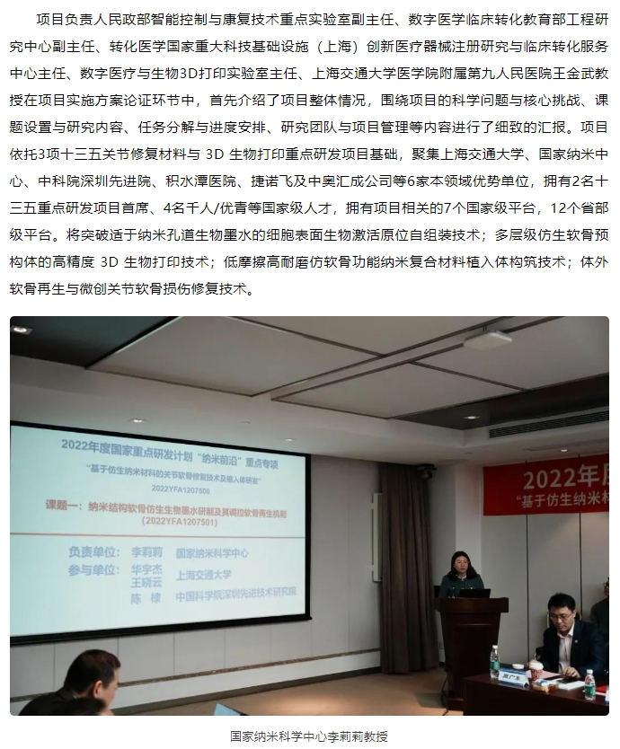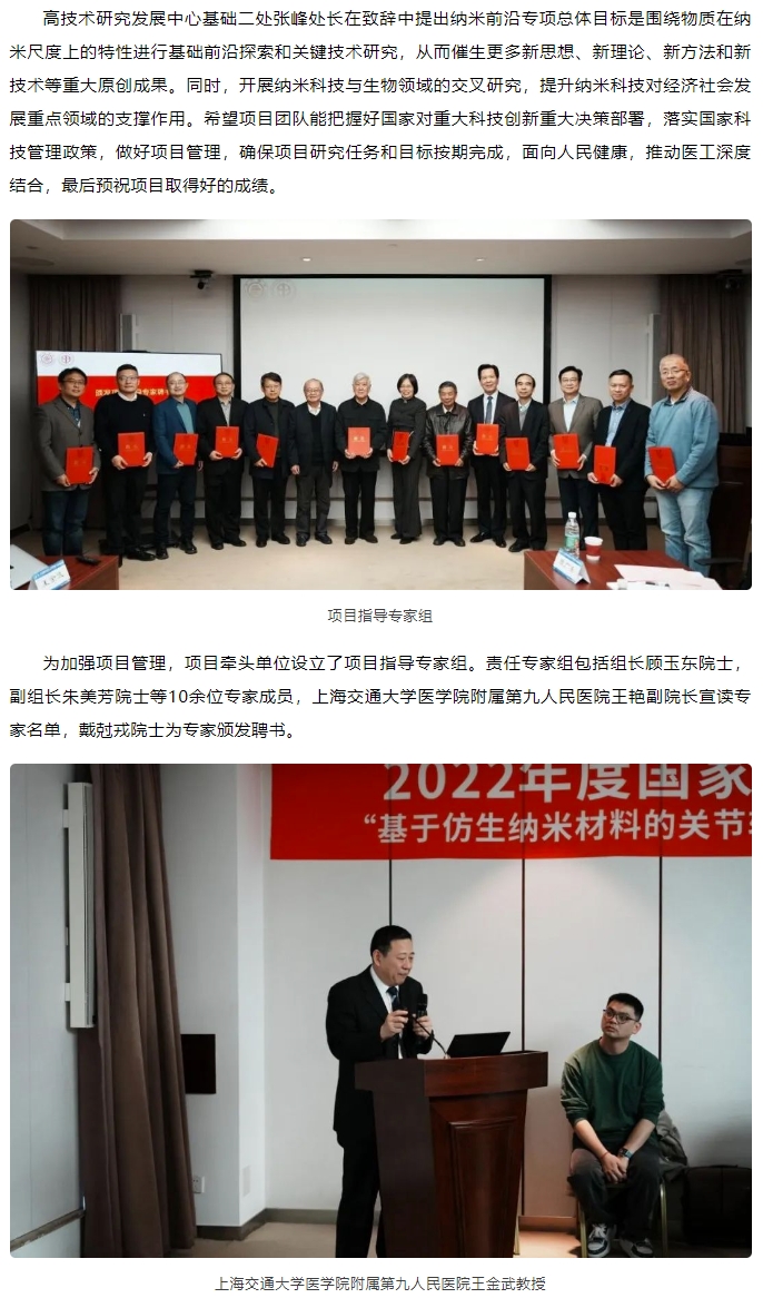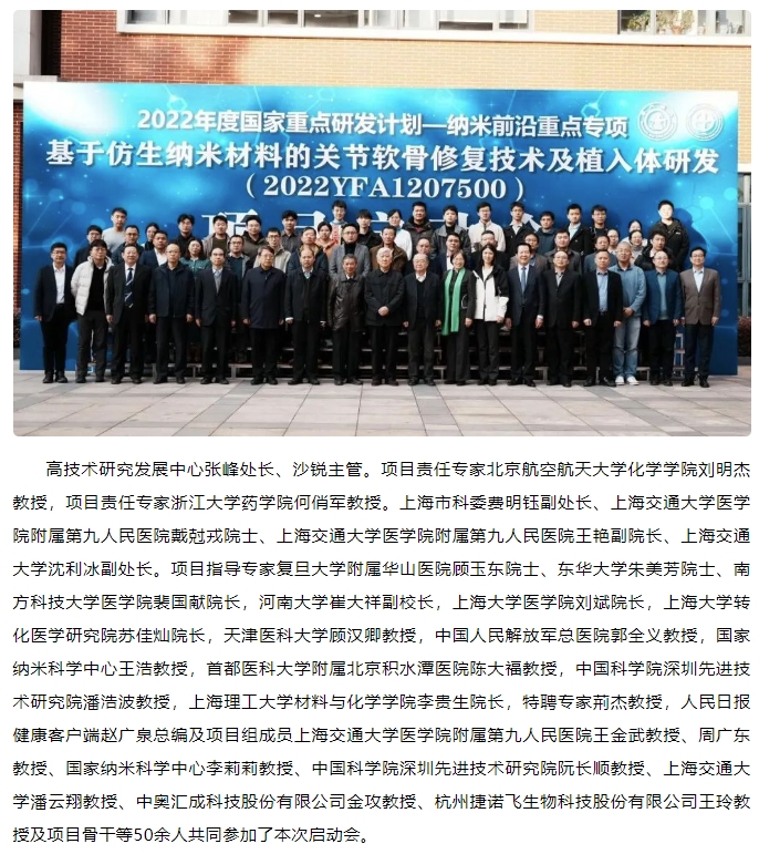 2023年11月24日,由上海交通大学医学院附属第九人民医院王金武教授牵头的国家重点研发项目—“基于仿生纳米材料的关节软骨修复技术及植入体研发(2022YFA1207500)”项目启动会暨实施方案论证会在上海交通大学医学院附属第九人民医院浦东科教园区顺利召开