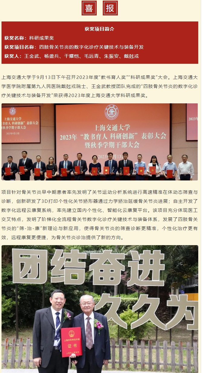 【喜报】戴尅戎院士、王金武教授团队完成的“四肢骨关节炎的数字化诊疗关键技术与装备